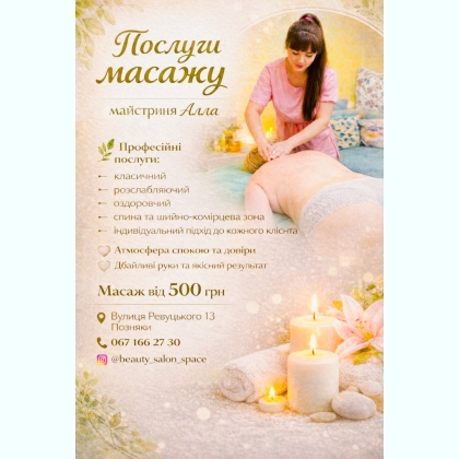 Вітаю! Мене звуть Алла. Я-сертифікований майстер з масажу. Працюю з 7 до 21.